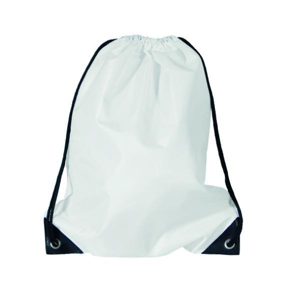Hvid gymnastikpose med sorte skulderstropper.